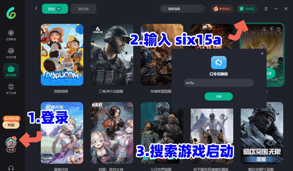 2.PC端可以進入:https://appupdate.sixfast2.com/official/pc/Sixfast_windows_683.exe進行下載。下載好之後跟住提示登錄註冊,喺會員中心搵到【兌換碼】,使用【six15a】先領取使用時長,先至可以用到軟件。亦都可以直接點擊:https://www.sixfast.com/tg-exchange 跟住下圖所示填寫兌換碼【six15a】,並按照右邊步驟註冊登錄Sixfast,領取時長。(支援手機同電腦)