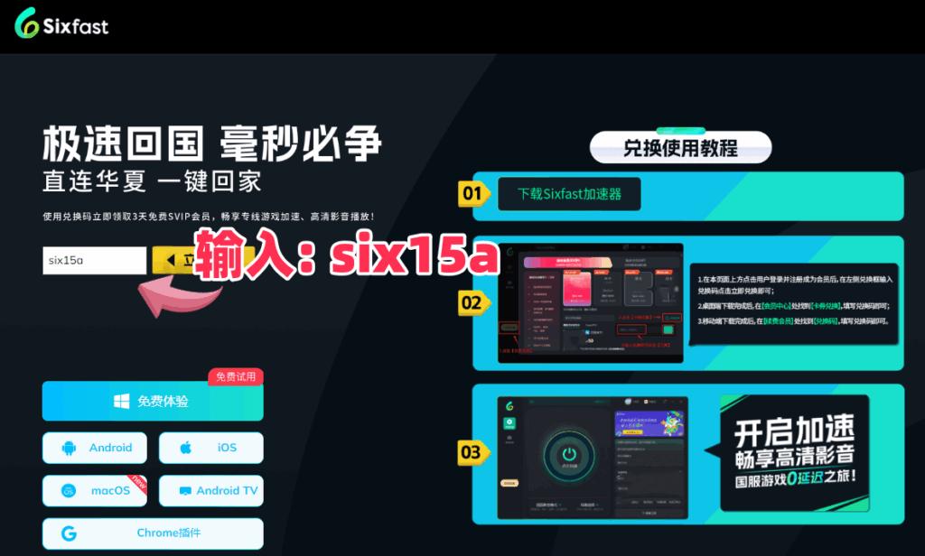 進行下載。下載好後按照提示登錄註冊,喺會員中找到【兌換碼】,使用【six15a】先領取時長,先至能夠使用軟件,亦都可以直接點擊:https://www.sixfast.com/tg-exchange 按照下圖所示填寫兌換碼【six15a】,並按照右邊步驟註冊登錄Sixfast,領取時長。(支持手機同電腦)