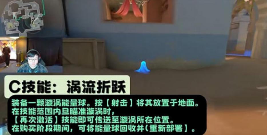 C技能「渦流折躍」:可以部署最多兩個漩渦能量球,玩家喺技能範圍內瞄準漩渦就可以傳送,傳送範圍24米而且可以穿越掩體。雖然傳送速度比較慢同需要提前部署,但係為哨位提供咗靈活嘅轉移能力,無論防守端快速換點定係進攻端同步進點,都能夠創造戰術優勢。