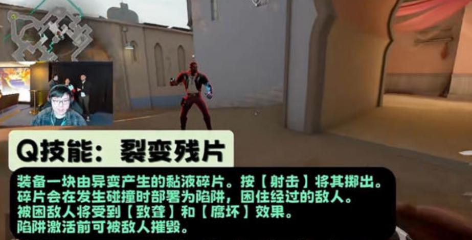 Q技能「裂變殘片」:擲出後形成陷阱,困住經過嘅敵人並造成致聾同腐化效果,類似黑夢嘅捆。可以用於進攻防繞後或者防守防rush,但係每回合只能裝備一個,防rush能力唔及維斯等英雄,需要部署喺拐角等隱蔽位置。