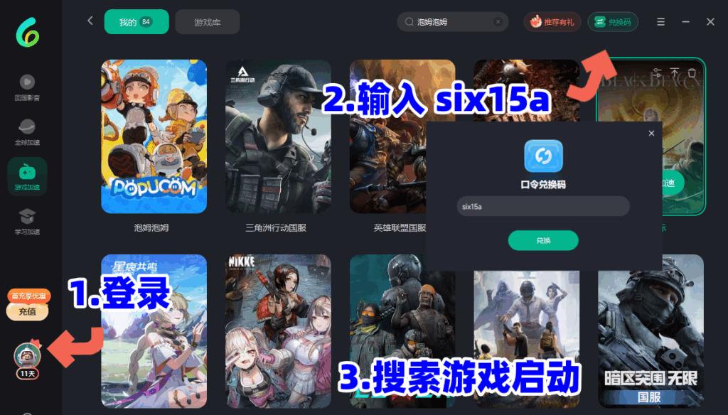 亦可以直接點擊:https://www.sixfast.com/tg-exchange 按照下圖所示填寫兌換碼【six15a】,並按照右邊步驟註冊登錄Sixfast,領取時長。(支持手機同電腦)