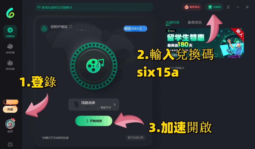 進行下載。下載好之後按照提示登錄註冊,喺會員中心搵到【兌換碼】,使用【six15a】先領取時長,先至能夠使用軟件。亦都可以直接點擊:https://www.sixfast.com/tg-exchange 按照下圖所示填寫兌換碼【six15a】,並按照右邊步驟註冊登錄Sixfast,領取時長。(支援手機同電腦)