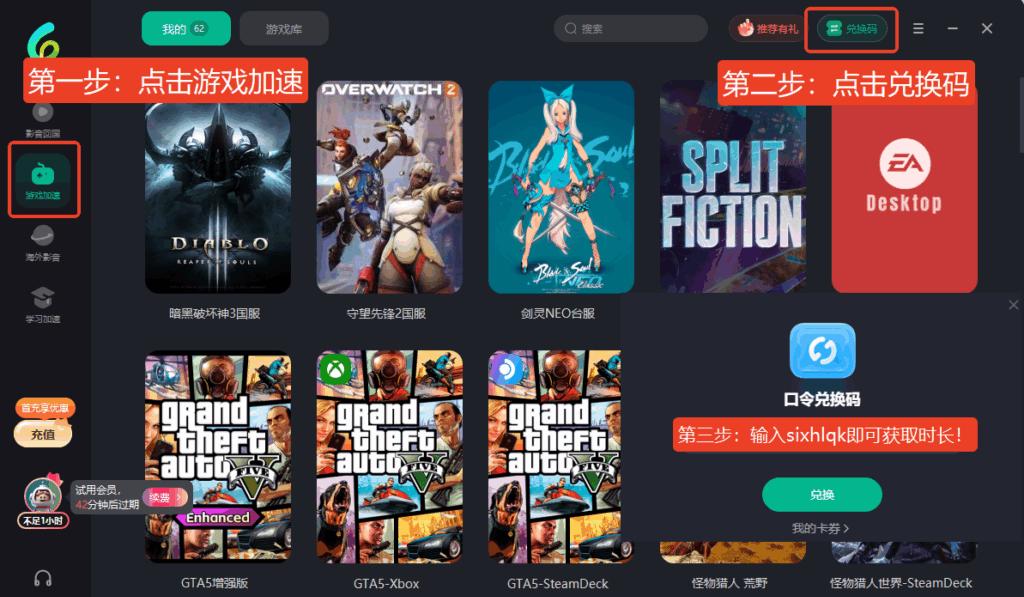 喺界面右下角搵到**【我的】–【兌換碼】-輸入【sixhlqk】-即可領取免費時長!兌換完之後,左方切換模式,搵到【遊戲模式】**,搜索你想玩嘅遊戲,流暢無卡頓暢玩!