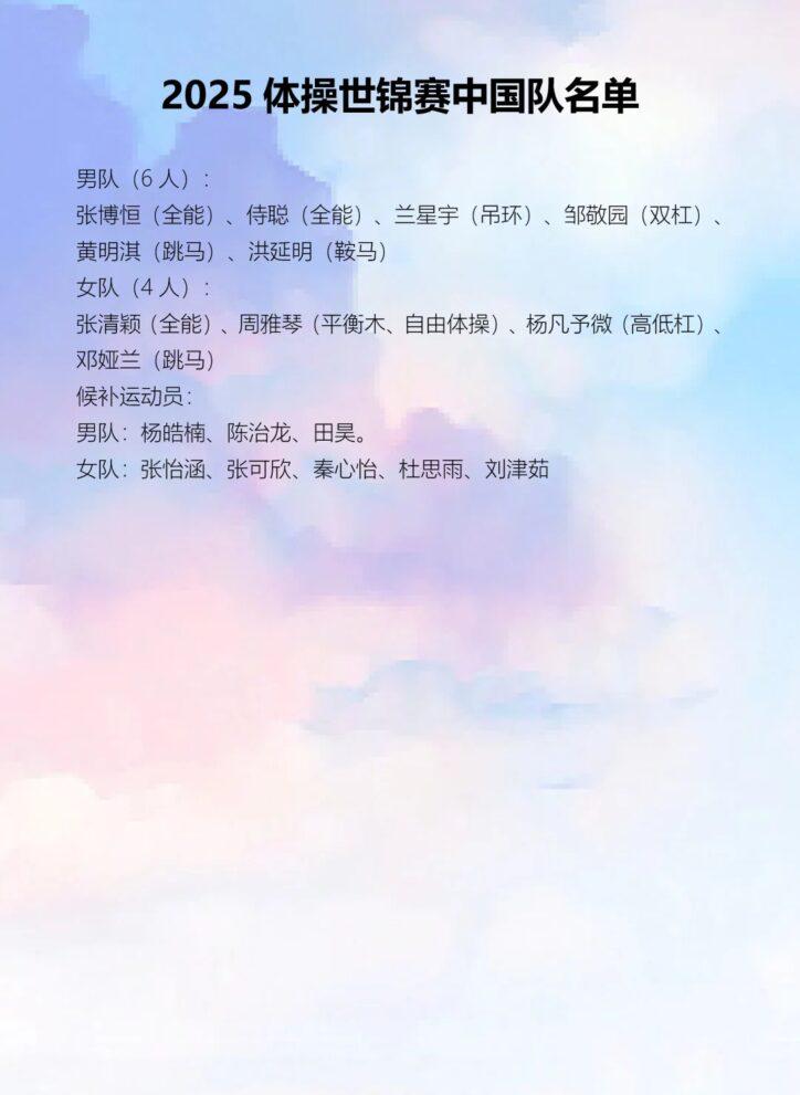 2025年體操世錦賽將會喺10月19號正式開鑼。男子項目方面,中國隊派出老中青三代運動員一齊出戰,由張博恒同鄒敬園帶頭,希望可以為中國男隊再創佳績。張博恒喺巴黎奧運會攞到銀牌,其實佢早喺2021年北九州世錦賽就已經攞到個人全能冠軍,雖然2022年利物浦世錦賽衛冕失敗,但係佢六個單項嘅均衡實力依然令人印象深刻。