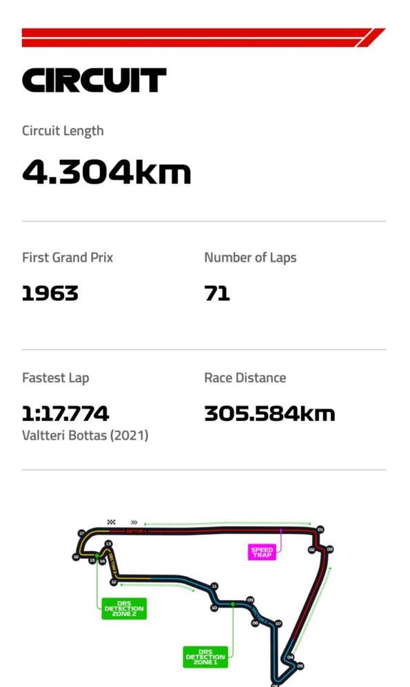 賽道全長4.304公里,總共有17個彎道,結合咗長直道同低速複雜彎道。其中,長達1.2公里嘅主直道(從1號彎到2號彎)容許賽車達到350公里/小時以上嘅極速,而隨後嘅”體育場彎道”——一個被觀眾席環繞嘅碗狀區域,就因為狹窄嘅彎道同近距離嘅觀眾氛圍,成為全場最具感染力嘅段落。歷史上,呢條賽道曾經見證過無數經典瞬間,1970年比賽因為20萬觀眾湧入導致賽事推遲嘅盛況,至今仍然係F1歷史上嘅傳奇一幕。
