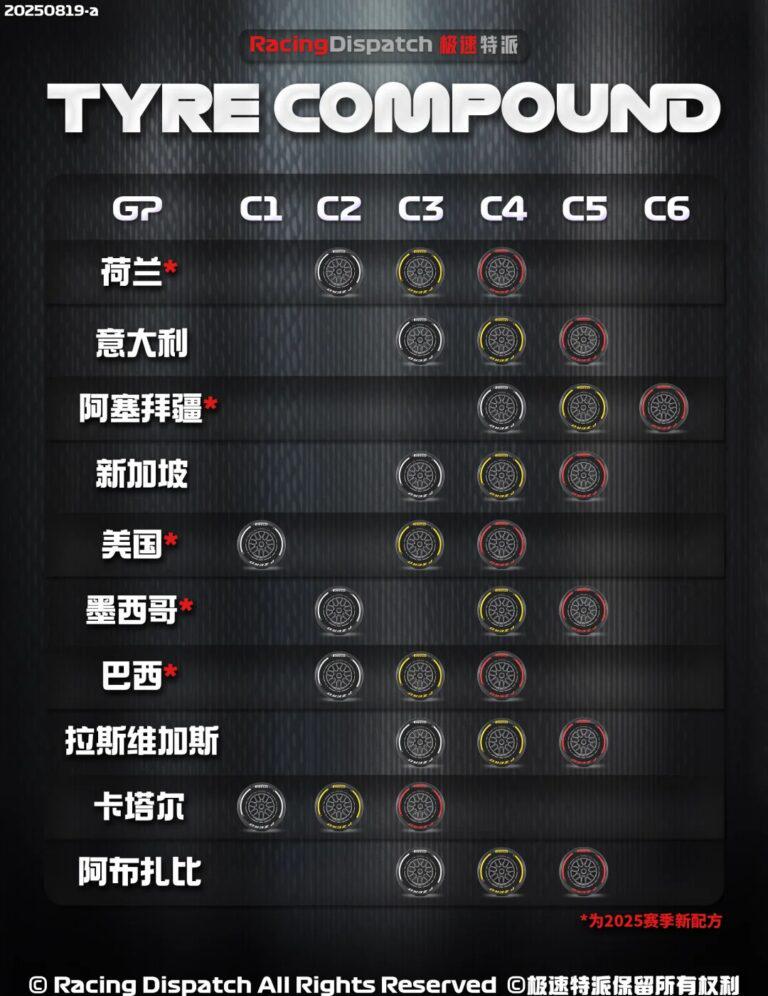 2025年墨西哥站嘅輪胎選擇成為賽事焦點之一。倍耐力為本站提供咗**C2(硬胎)、C4(中性胎)、C5(軟胎)**嘅非連續配方組合,跳過咗C3配方。呢個”跳躍式”選擇旨在擴大唔同輪胎之間嘅性能差距,迫使車隊喺一停同兩停策略之間做出更進取嘅抉擇。倍耐力賽車運動總監馬里奧·伊索拉解釋,模擬數據顯示兩停策略喺墨西哥會比一停快幾秒,呢個設置將會鼓勵車隊採用更具攻擊性嘅策略,增加比賽嘅不確定性。