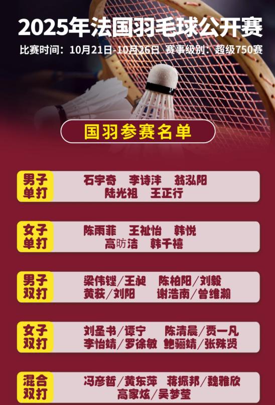 從歷史戰績睇,國羽喺法國公開賽表現穩健。2024年作為奧運測試賽,中國隊一舉奪得男單(石宇奇)、女雙(陳清晨/賈一凡)、混雙(馮彥哲/黃東萍)三項冠軍,展現咗強大嘅整體實力。2025年,陳清晨/賈一凡、鄭思維/黃雅瓊等主力組合依然係雙打項目嘅奪冠熱門,而男單選手石宇奇能否延續2024年擊敗昆拉武特嘅良好狀態,女單選手點樣挑戰安洗瑩、山口茜嘅統治地位,將會成為國羽賽事嘅核心睇點。