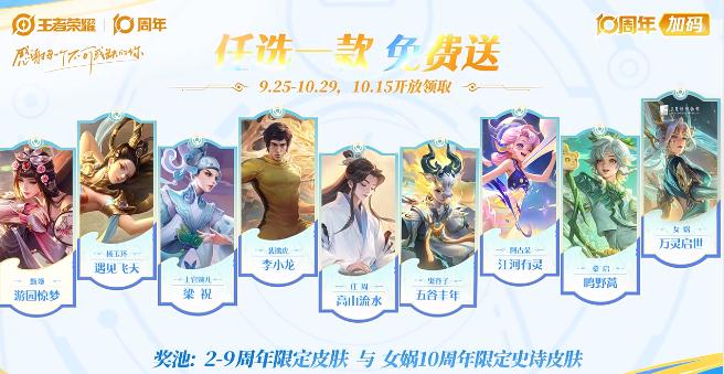 • 第一款:參與活動可免費兌換任一款2-9週年限定皮膚與10週年限定史詩皮膚