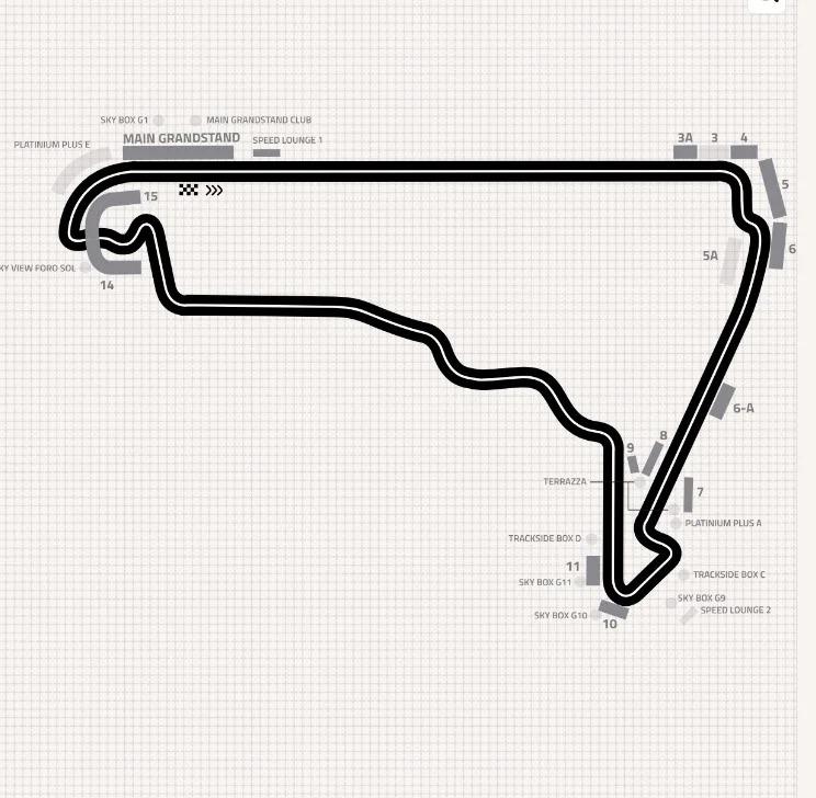 赫爾曼諾斯·羅德里格斯賽道全長4.304公里,經過2015年大規模現代化改造之後,形成咗「長直道+技術彎道+體育場段」嘅獨特佈局。賽道最突出嘅特徵係佢嘅高海拔環境——2240米嘅高度令空氣密度比海平面低約25%,呢個對賽車嘅動力單元同空氣動力學設計構成雙重挑戰。由於空氣稀薄,發動機嘅進氣效率下降,車隊需要通過特別嘅引擎調校嚟彌補動力損失;同時,低空氣密度導致下壓力減少,賽車喺高速過彎時嘅穩定性降低,考驗車手嘅操控精準度。