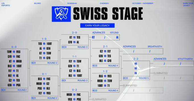 - 瑞士輪:10月15日至25日(北京),16支隊伍通過五輪比賽決出八強,戰績相同嘅隊伍會進行BO3對決。