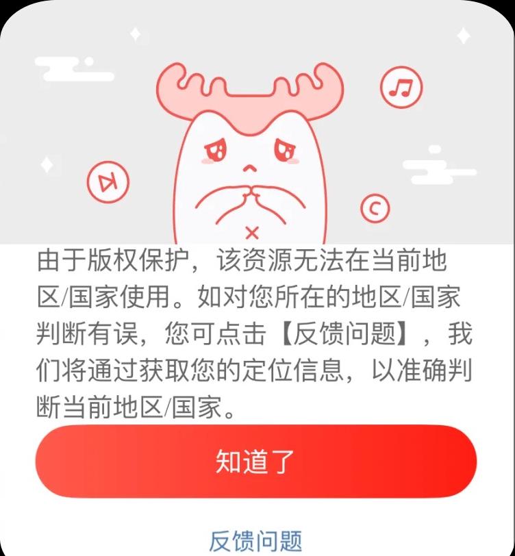 國內常用嘅幾款音樂應用喺海外均無法正常使用,比如網易雲音樂、QQ音樂等。打開軟件後,常常會顯示「根據當地法律政策,此功能當前無法使用」之類嘅提示。至於微信裡分享嘅音樂鏈接,點擊後亦只能打開一個空白頁面。
