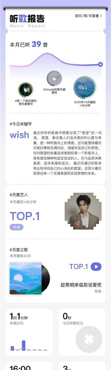 事實上,QQ音樂的聽歌報告遠不止是簡單的播放記錄。它像一位貼心的音樂管家,為你精心整理每日、每週、每月甚至每年的聆聽軌跡。從「月度藝人」到「月度之歌」,從「今日關鍵詞」到「耳朵解鎖的城市」,每個數據都在訴說你的音樂故事。
