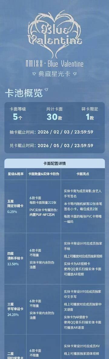 這次NMIXX的《Blue Valentine》典藏卡更是殺瘋了——限量222張的親簽卡、拓印手寫寄語的幸運卡、還有會發光的團體碎卡設計。但當你點開預約連結,卻發現MV卡成PPT、歌單灰了一大片,連歌詞都對不上拍子…