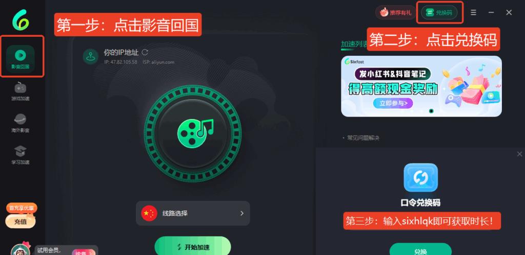 右上角【兌換碼】-輸入**【sixhlqk】**-領取免費時長!兌換完成後先可以加速!記得先兌換然後再左邊搵到【遊戲模式】/【影音回國】-點擊【開始加速】