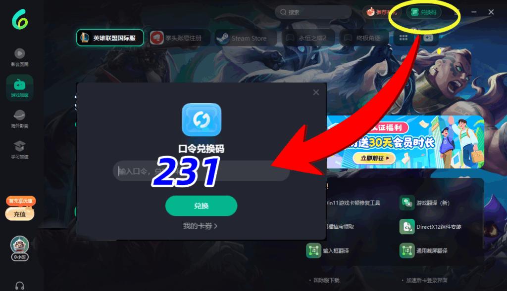 右上角**【兌換碼】-輸入兌換碼【231】-領取免費**時長!兌換完成後先可以加速!!!