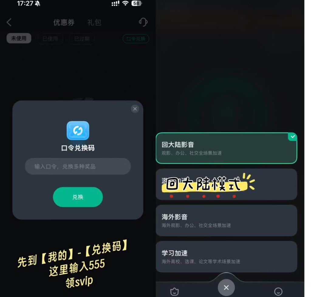 2、下載好後按照提示登錄註冊,喺會員中找到【兌換碼】,使用【six13yy】先領取時長,先至可以使用軟件,亦都可以直接點擊:https://www.sixfast.com/tg-exchange 按照下圖所示填寫兌換碼【six13yy】,並按照右邊步驟註冊登錄Sixfast,領取時長。(支持手機和電腦)