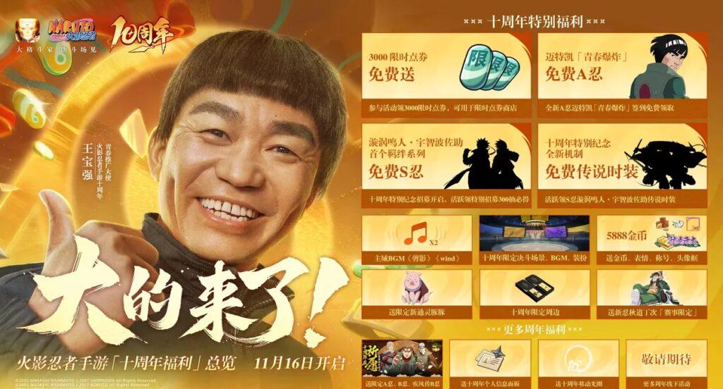 《火影忍者手遊》十週年慶典由11月16號開始,包括首波S忍獲取、週年慶邀請賽、慶典高潮同線下盛典,一直持續到明年1月底。今次慶典仲聯動咗王寶強同邁特·凱,推出限定A忍同福利,免費S忍,免費時裝福利等。