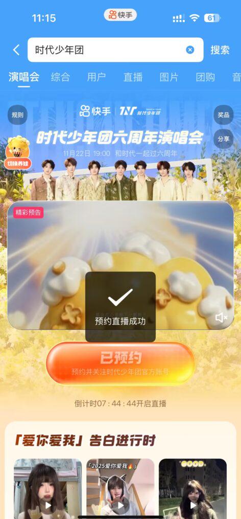 重啟快手APP,搜尋「時代少年團六週年演唱會」,直接點擊「預約直播」,多機位直拍、後台花絮直播都會自動同步提醒;