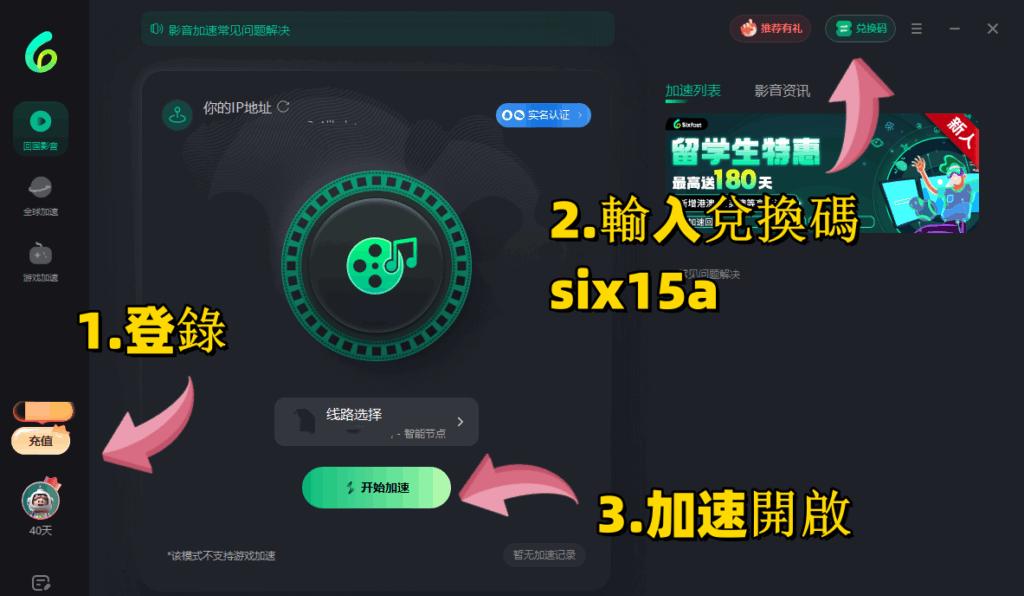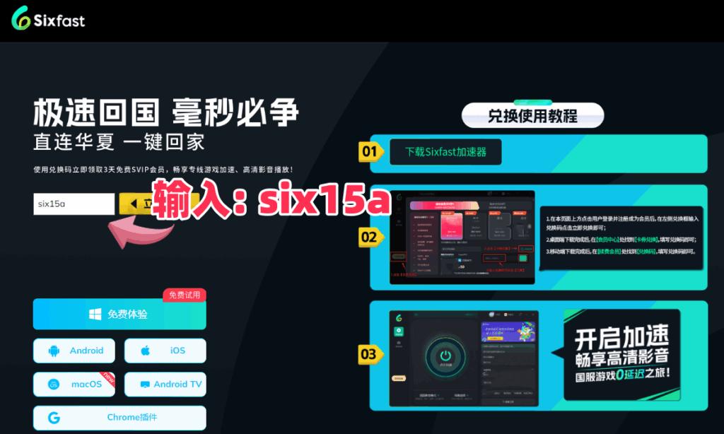 2.PC端可以進入:https://appupdate.sixfast2.com/official/pc/Sixfast_windows_683.exe進行下載。下載好之後按照提示登錄註冊,喺會員中找到【兌換碼】,使用【six15a】先領取時長,先至可以使用軟件。你亦都可以直接點擊:https://www.sixfast.com/tg-exchange 按照下圖所示填寫兌換碼【six15a】,並按照右邊步驟註冊登錄Sixfast,領取時長。(支援手機同電腦)