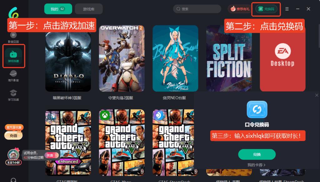 右上角【兌換碼】-輸入**【sixhlqk】**-領取免費時長!兌換完成後先可以加速!記得先兌換然後再左邊搵到【遊戲模式】/【影音回國】-點擊【開始加速】