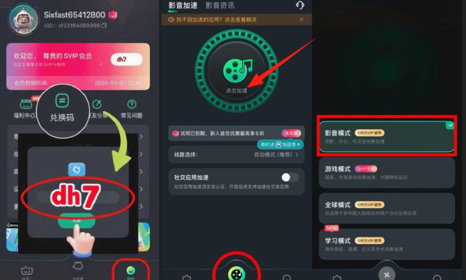 2.下載好後按照提示登錄註冊,喺【我的】中點擊【兌換碼】,輸入***【dh7】***即可領取免費加速時長。