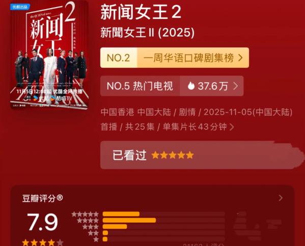 數據唔會講大話:《新聞女王2》11月5日喺優酷獨播後,平台熱度迅速突破8200,香港地區最高收視達20.9點(覆蓋135萬觀眾),登頂當地收視榜;豆瓣開分7.9,雖然略低於開播初期嘅8.5分,但係仍然遠超同期其他劇集,位列豆瓣實時熱門電視榜第五,評分人數超過兩萬。商業層面更加創下港劇歷史紀錄——30+品牌合作,廣告總收入突破港劇天花板,站內預約量早喺開播前就突破150萬,預告片海外播放量更加高達3.69億次。
