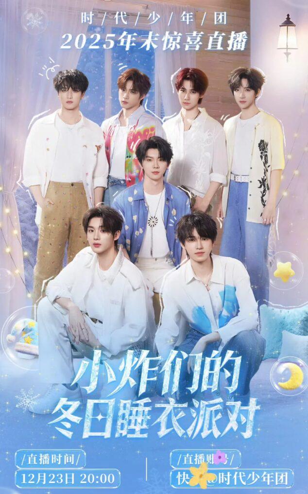 各位爆米花注意啦!2025年壓軸嘅粉絲福利殺到!時代少年團官方正式宣布,將會喺12月23號晚上8點正,喺快手平台搞一場「冬日驚喜睡衣派對」專屬直播。七位少年將會著住舒服嘅睡衣,同大家見面,不但會首唱新歌,仲有各種趣味互動同獨家幕後花絮大放送,用最治癒嘅氣氛為2025年收尾,送上限量版嘅年末寵愛畀各位粉絲!