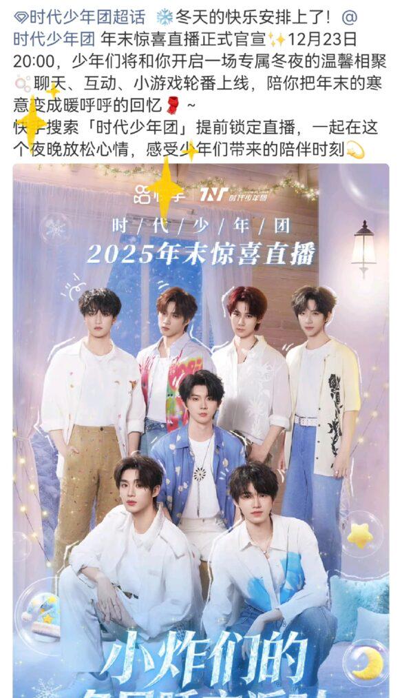 除咗今次睡衣派對直播,時團12月嘅行程真係「誠意滿滿」:啱啱結束鴻蒙星光盛典、星光大賞嘅舞台,跟住就帶來新歌 + 直播,之後仲會參加12月26號同28號嘅TF家族新年音樂會,以及12月31號湖南衛視嘅跨年演唱會。連續解鎖舞台、直播、綜藝多重驚喜,真係堪稱「年末勞模團」!不過粉絲們都紛紛呼籲:「舞台再精彩,都要注意休息呀」,呢種暖心互動讓雙向奔赴更加動人。