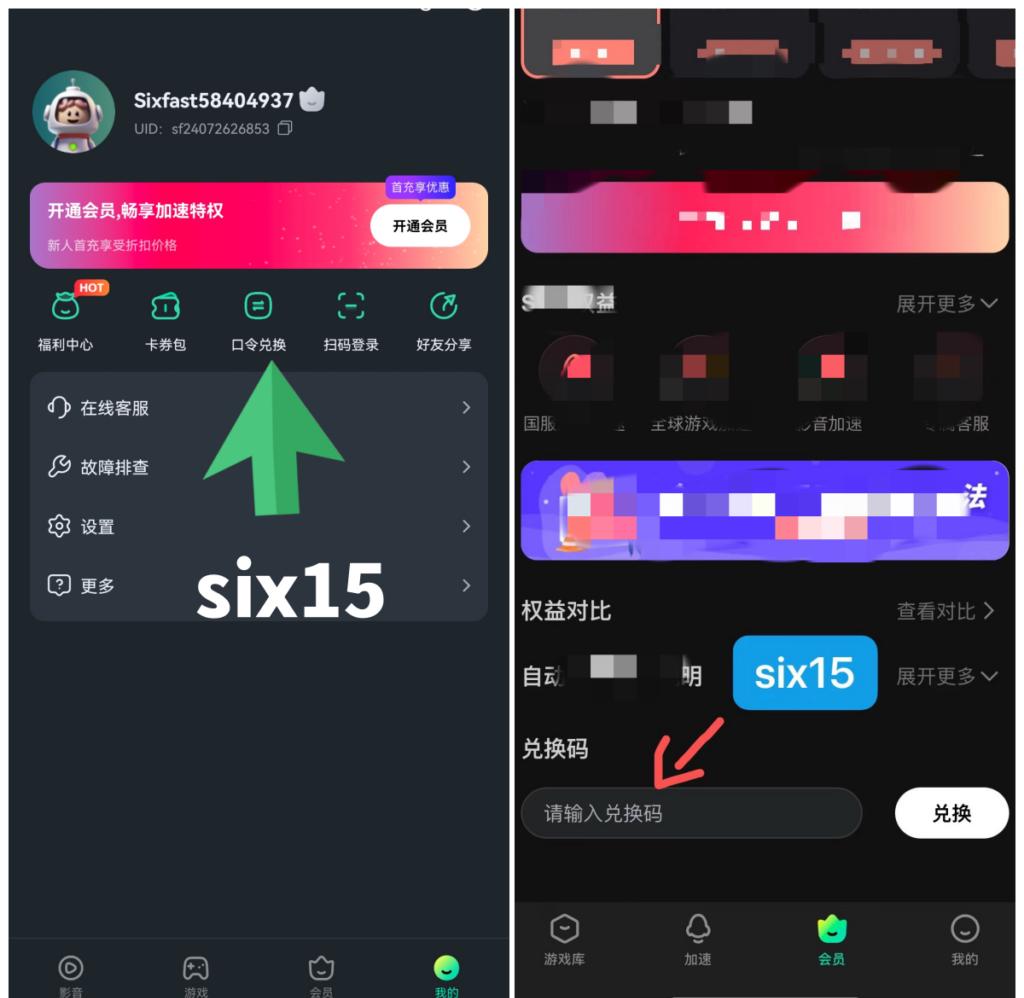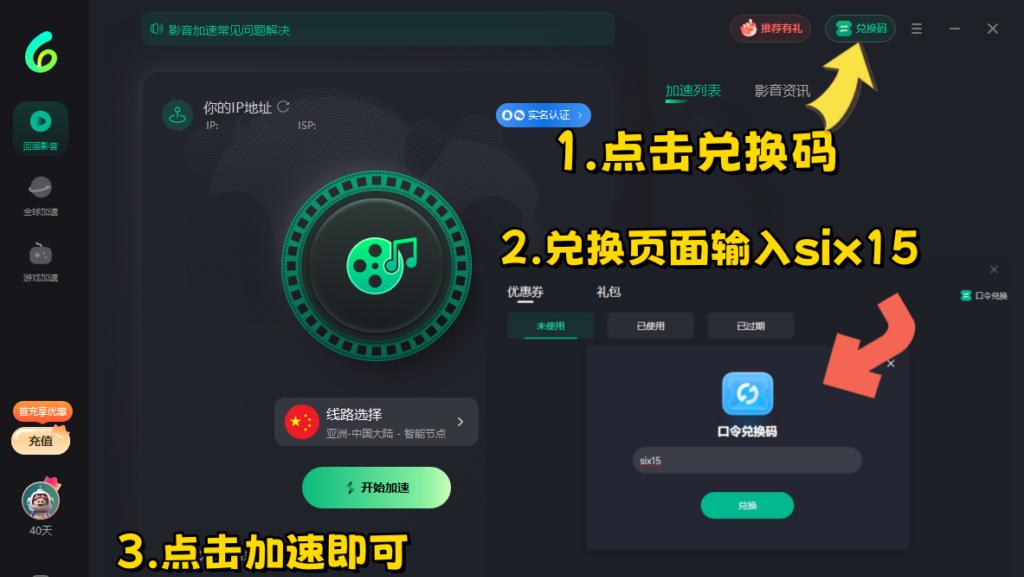 下載並註冊帳號之後,最重要嘅一步就係兌換免費時長。喺App右上角或者「會員」頁面搵到「兌換碼」入口,輸入 six15,即可成功領取72小時免費加速服務。記得要兌換咗先好使用啊!