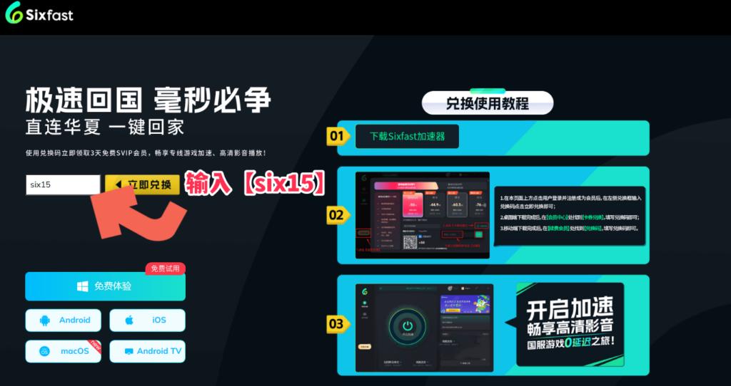 另外,你也可以直接去Sixfast嘅官方兌換頁面:https://www.sixfast.com/tg-exchange,跟住下圖所示,填寫兌換碼【six15】,然後跟住右邊步驟註冊登入,一樣可以拎到時長。呢個方法手機同電腦都通用,非常方便。