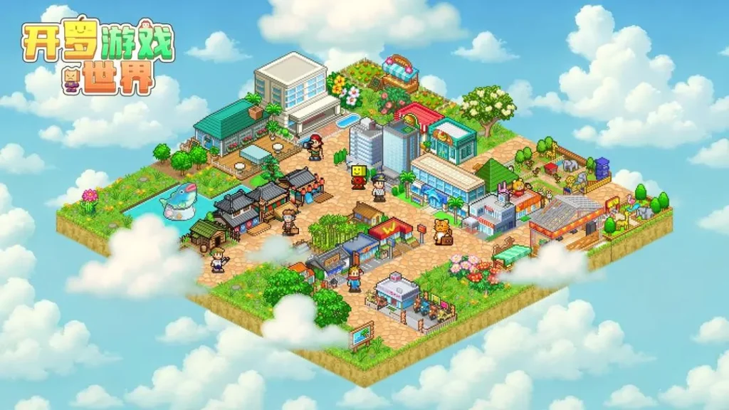 《開羅遊戲世界》遊戲宣傳圖,展示像素風格嘅繁華遊戲街道