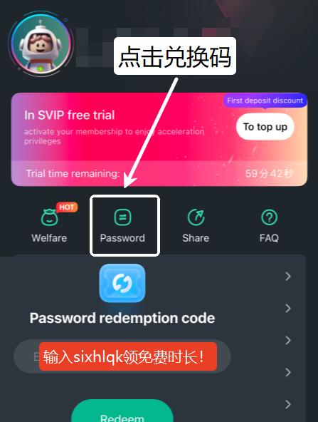 下載安裝好之後,按照提示登錄或者註冊帳號。然後喺客戶端裏面搵到「口令兌換」功能,輸入專屬優惠碼 【sixhlqk】,就可以即刻領取免費加速時長,試用下效果先!