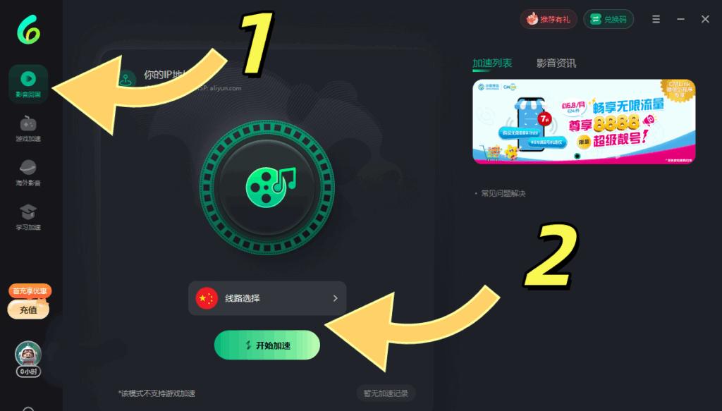 記得先兌換然後喺左邊搵到【影音回國】- 點擊【開始加速】