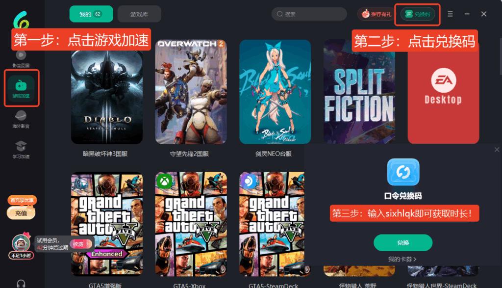 Sixfast返國加速器係一款專為海外華人打造嘅加速器,擁有百萬海外華人用戶信賴,並以穩定、高速、安全嘅特點著稱。佢能夠有效解決海外用戶訪問國內網絡時遇到嘅各種問題,令你輕鬆暢享國內遊戲、視頻、音樂、直播等內容。使用兌換碼【sixhlqk】仲可以領取72小時免費加速時長。
