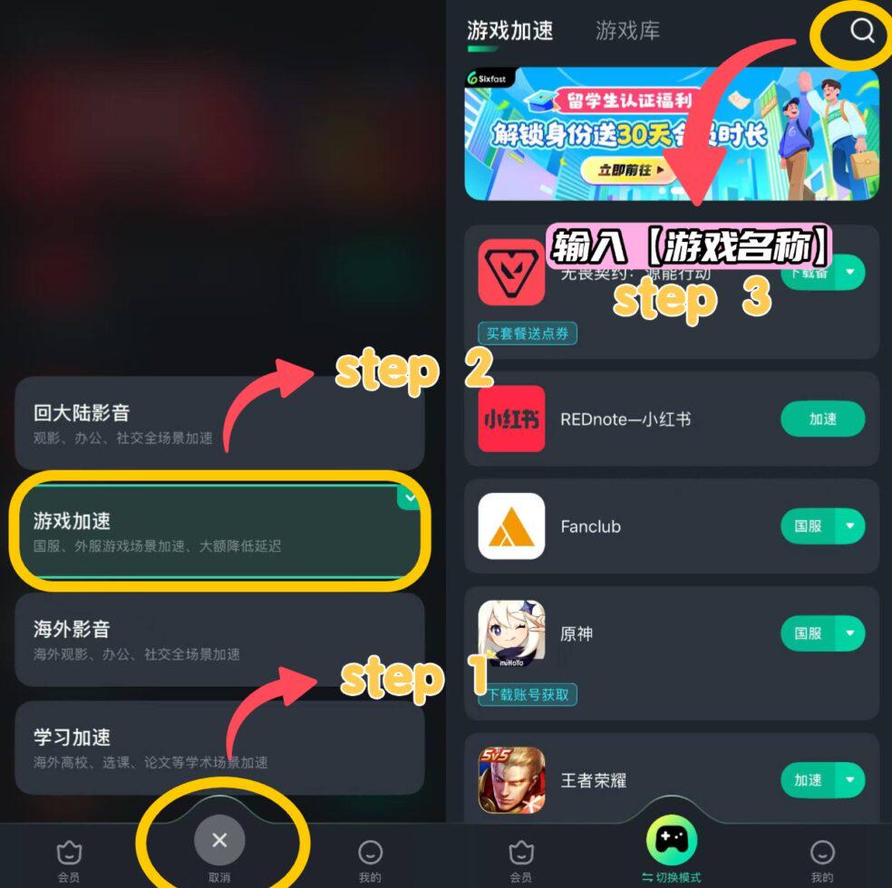 ②兌換完之後,下方切換模式,搵到**【遊戲模式】,右上方搜索【遊戲名稱】**-點擊加速,亦都可以搜索其他國服遊戲,流暢無卡頓暢玩!