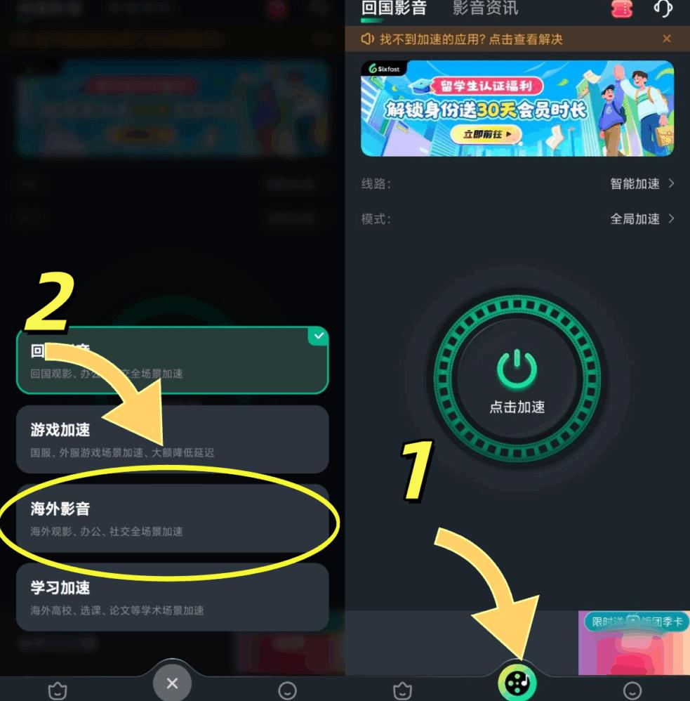 ②兌換完之後,先可以去下面**【切換模式】,搵到【海外影音】,地區轉到啱啱X**裡面填嘅位置地區,撳加速