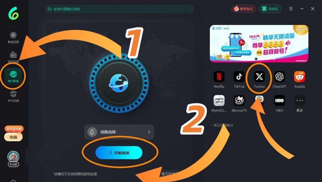 記得先兌換然後喺左邊搵到**【海外影音】地區轉到啱啱X裡面填嘅位置地區,-撳【開始加速】**
