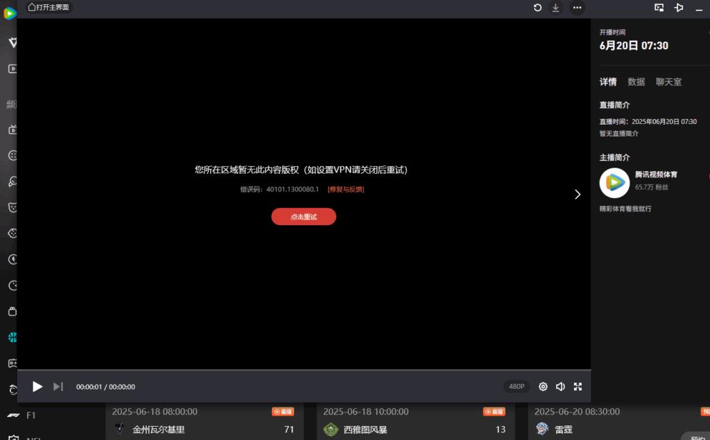 由於各個地區同國家嘅服務商唔同,各地嘅區域調整都有差異,國內正常播放嘅NBA比賽直播同重播等賽事嘅中文直播,喺部分地區係冇辦法正常收睇嘅。海外地區使用國內平台睇直播時,會出現好似下圖顯示「您所在的地區 暫不支持的」嘅問題。